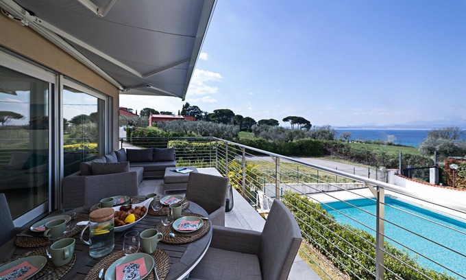 Elegant three-family villa located in Lazise, 2.5 km from the city centre and about 500 metres from the beach, accessible via a private pedestrian gate. The refined property, of around 400 sq m, stands out for its great attention to detail, designed to ensure maximum comfort, and for the breathtaking view of the lake that it offers as soon as you enter the living area.The interiors of Villa Julia, which extend over about 120 sq m, are characterised by carefully designed furnishings that add modernity and charm to the rooms. Located on the ground floor, the sleeping area consists of three double bedrooms, two of which have wardrobes and TVs (no Sat), while the master suite, overlooking the covered terrace and garden, has a TV (no Sat), a walk-in wardrobe and a private en-suite bathroom with a large flush-to-floor shower and double sink. A second bathroom with a shower cubicle completes the ground floor. All rooms are equipped with mosquito nets to ensure maximum comfort.On the first floor of Villa Julia, the living area features a fully equipped kitchen with high-quality Miele appliances such as an induction hob with a Bora extractor hood, oven, steam oven, dishwasher, fridge with freezer, wine cellar, coffee machine and toaster. The living room with panoramic views of the pool area and the southern shore of Lake Garda is furnished with a large sofa and a smart TV. The dining area with a natural wood table can accommodate up to 8 people. Through the sliding door with large windows, you access the terrace with an electric awning, furnished with a relaxation area and a table for pleasant outdoor breakfasts. A third fully-windowed bathroom with a convenient washer-dryer for guest use is located on the first floor.The garden of Villa Julia, which extends on two sides, offers direct access to the shared pool (guaranteed opening period 01/05-30/09), with a practical sunbathing area. In the garden and on the spacious covered veranda there are two sun loungers and a comfortable lounge area to relax in the hottest hours.Free Wi-Fi and air conditioning are available. The property is completed by 3 reserved parking spaces, one of which is covered, within the property.The final price is made up of:- RENTAL FEE paid directly to the owner, on whose behalf Regarda acts- GUEST SERVICES (check-in, check-out, sheets, towels, courtesy line, on-site assistance, professional cleaning, booking management, commission paid by the host to the portal, correspondence etc.) offered by Regarda Travel to the tenant.Mandatory tourist tax to be paid in cash upon arrival.Mandatory refundable security deposit to be paid by credit card upon arrival of €2,000.00Regarda Travel is a real estate management agency located in Lazise, on Lake Garda, with years of experience in tourism and hospitality. We manage over 80 houses, villas and apartments with the satisfaction of our guests. We live in the area and therefore know it very well, so we can proudly show you the best experiences you can enjoy in this famous area of northern Italy. We can advise you on the best guided tours to explore the beauty of Lake Garda, Verona, Milan, Valpolicella, Venice and Mantua, boat trips, bike tours, food and wine tours... and much more! We are also at your disposal to book tickets for the Opera at the Arena di Verona, car rental, private transfers, discounted tickets for the main thermal spas and amusement parks such as Gardaland, Caneva or Movieland.