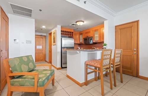 The kitchen at the studio is fully equipped for an extended stay and is ideal for those who like to socialize while preparing meals, as it is adjacent to the living room. The kitchen has granite countertops, a bar counter with 2 stools, a full-size fridge, a microwave, a stovetop, and a dishwasher.