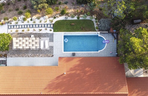Our spacious three-bedroom house has a sea view from every room and from the front patio and the swimming pool. It conceals an interior of contemporary design with high timber ceilings and large windows giving a feeling of space and light. The open plan living area which features a working stove is furnished with comfortable sofas and a pool table.