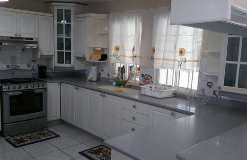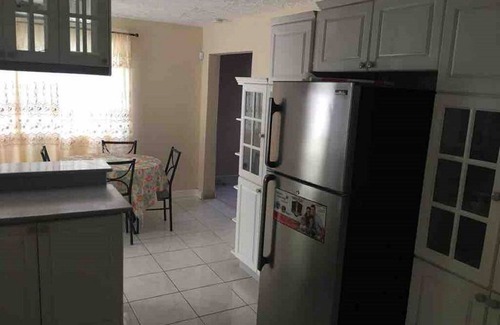 Our exceptional clean home features 3 spacious bedrooms (2 with AC, all 3 with ceiling fans), Master bedroom with ensuite has a queen size bed, 32 inch LED TV, A/C with ceiling fan and walk in closet. Second bedroom has two double beds with ceiling fan. Third bedroom with ensuite has a queen size bed, 32 inch LED TV, A/C with ceiling fan. 3 nicely appointed hot water shower bathrooms, large eat-in kitchen that is equipped with modern stainless steel appliances (gas stove, fridge) microwave; and all the tools needed to cook all your Caribbean meals. The large formal dining room seats 6 comfortable .