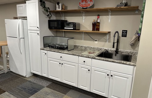 Full kitchen; includes 2 burner table top stove, microwave, toaster oven and refrigerator.