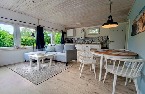 Layout: Ground floor: (Living room(TV, dining table, seating area), open kitchen(electric kettle, cooker, coffee machine, oven, fridge), bedroom(double bed), bedroom(bunk bed), bathroom(shower, washbasin, toilet)) grill, terrace, garden, garden furniture, BBQ, parking, play equipment, play equipment