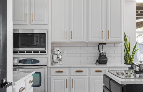 The fully equipped chef’s kitchen features stainless steel appliances, ample counter space, and essentials like a Phillips Air Fryer, Ninja Blender, KitchenAid Mixer, toaster, and rice cooker — plus a dedicated coffee station to start your day right.