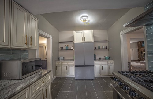 - The kitchen has a dishwasher, gas oven/stove, microwave, standard refrigerator, teapot, & coffee machine