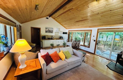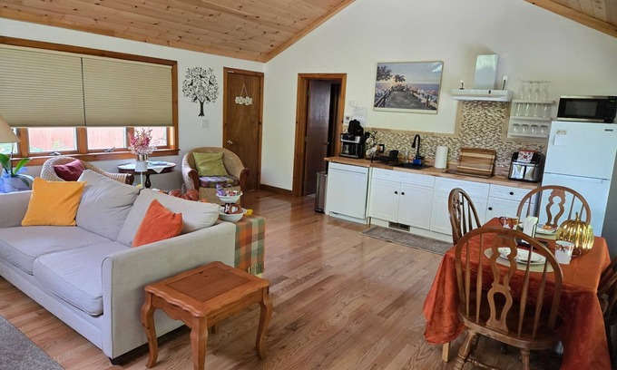 Welcome to this charming studio in East Falmouth. First time offered for rent, this superb property offers a cozy bedroom and a large bathroom with oversize walk in tiled rain shower for guests to relax in. The Main room boasts a cathedral ceiling with many windows to let the natural light shine in. Living room offers a pullout sofa for extra bedding for family or friends. With a cool vibe and wonderful ambiance, this studio is the perfect retreat for your vacation. A great place to call homebase while you're away. Located at the end of a quiet street. Bring your kayak, 5 minute walk to Jenkins Pond and enjoy a paddle, fishing or swimming. A beach buggy is available for easy towing of our beach chairs, umbrella & beach towels & a cooler. Or relax on our quaint quiet patio and listen to the birds and sounds of the nearby pond. Perfect for reading a book or remote work. Or have a BBQ on our grill. There also is a wonderful outside shower (seasonally), a must in New England in the summer! Less than 4 miles to the Island Queen seasonal passenger ferry to Martha's Vineyard. 10 minute drive to downtown Falmouth. 10-15 minute drive to Falmouth area beaches. Studio is attached to a main house, however, has completely different entrances and no shared space or parking. Please inquire about discounts for longer stays over 28 days!! A great way to enjoy the Cape in the off season as well! Also booking for 2026 summer season