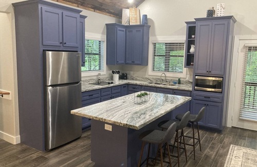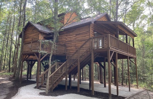 Our treehouse is literally a cozy cabin in the sky, offering the amenities of home in an elevated atmosphere. This treehouse has a master bedroom with a king-size bed and a second upstairs bedroom with two king-size beds, plus a bath/shower, living area, dining area, kitchenette, and four, yes four, porches to sit out and enjoy the tree top views! The kitchen includes a stove top, microwave, refrigerator, coffee maker, toaster, pots, pans, cooking utensils, place settings and eating utensils. This treehouse also has a propane gas grill. Sleeps 6. Smoking and pets are not allowed.