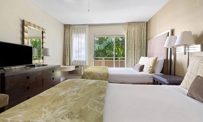 Step into a world of relaxation, surrounded by swaying palm trees and vibrant hibiscus blooms. Your spacious suite features a full kitchen, separate living room, and private lanai. Refresh yourself in our sparkling outdoor pools, perfect for relaxation or family fun. Unwind in the soothing hot tubs while gazing at the starry Hawaiian night sky for ultimate relaxation. Offering family-friendly amenities and a convenient location, we provide the ideal home-away-from-home for your Hawaiian getaway.