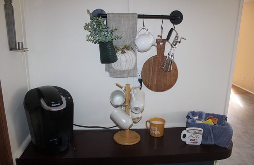 The kitchen is fully stocked with everything you need to prepare meals—just bring the food! You’ll also find a welcoming coffee bar, complete with all the essentials to start your morning off right.