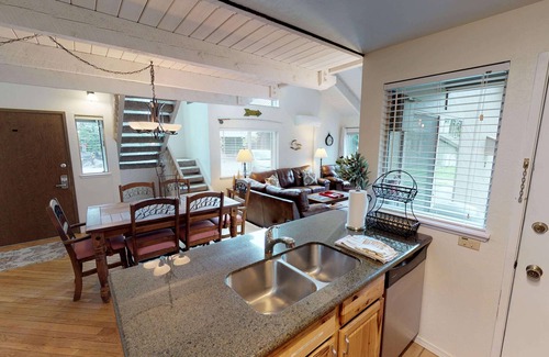 Just steps from The Spa at Sunriver Resort, 2 Tennis Village is the perfect basecamp for exploring Sunriver and beyond. This 1,580 sq. ft. condo is enjoyable for up to 6 guests, offering 2 bedrooms and 2 bathrooms. Inside this lodge-style condo you will find spacious kitchen, living, and dining areas with vaulted ceilings, wood paneling and beam accents.