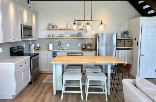 Fully equipped kitchen with pots and pans, dishes, cups, and utensils, and a Keurig single cup coffee maker with a few kcups to get you started. The spacious islands seats 4 comfortably with 2 extra stools if needed.