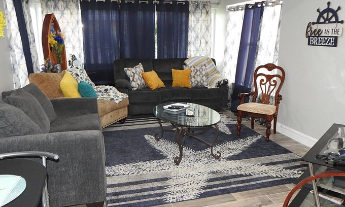Our 4 bedroom 5 bed home has 3 Queen beds & 2 twin beds w/ 2 full bathrooms featuring infinity walk in showers. Master bedroom has a master bathroom. We are only 6 miles to the Ft Lauderdale Airport & 8 -10 miles from several beaches. Hard Rock casino 10 mins away. The living area is cozy w/ beach theme décor. Fully stocked galley kitchen w/ stainless steel appliances for cooking. High speed Wi-Fi, cable, streaming services, patio & grill. Guests have full access to washer/dryer w/ tide pods for laundry.