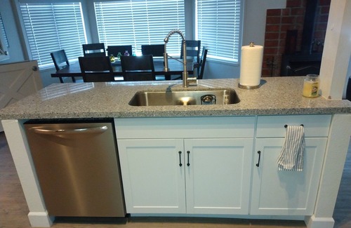This gorgeous home was designed with entertaining in mind. Open floor plan with 2 family rooms. Brand new kitchen has white cabinets, stone countertops, huge walk-in pantry, coffee bar and a large dining room table that seats 8 perfect for dining or playing games. Entrance through the front of this home has a mud room to hang coats/hats and store your shoes/boots. The central area has vaulted ceilings and great room is open to the kitchen. Master King bedroom is downstairs with a private bath and an amazing walk-in custom tiled shower. 2nd King bed is downstairs along with the separate bathroom and laundry room. 1/2 BD with Trundle day bed room #5. 2 twin beds and a queen bed upstairs. Many comfy recliners downstairs to enjoy as well, plus a roll-a-way bed for a 11th person to sleep. Plenty of couch space as well.