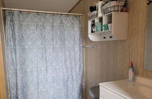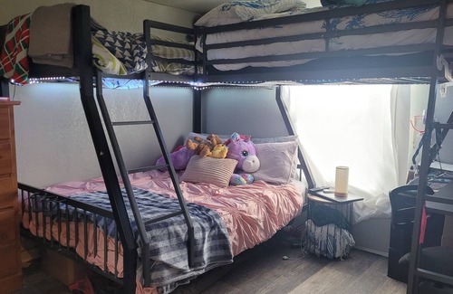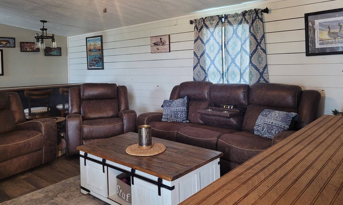 2 bedrooms and 2 baths. King master with en suite bath. 2nd bedroom boasts a triple bunk with 2 twins on top and a full on bottom. Porch with seating, lights, fan, and a bonus bbq pit for your enjoyment! Covered parking for at least 3 vehicles. Space for a boat, golf cart, and an rv too! Bring the pets with you.