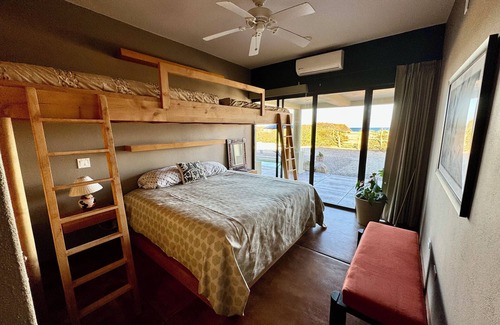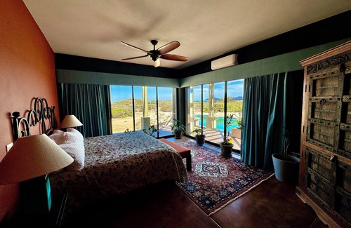 Unwind in our three-bedroom, two-and-a-half-bathroom vacation home that boasts unparalleled comfort and breathtaking views. Immerse yourself in opulence while being surrounded by the natural beauty of the Baja California desert and the Sea of Cortez. The house can hold up to 14 guests. Also included is: fully-equipped kitchen, dining room, living room with a TV and fireplace, and an outdoor patio by the pool.