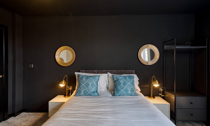 Bedroom 1 offers a comfortable double bed accompanied by two bedside tables and lamps, ensuring a restful night's sleep. You'll also find an open wardrobe, wall art, and cushions to enhance your comfort. Reflect on your style with three mirrors and indulge in convenience with a dressing table and chair, creating an inviting space for relaxation.