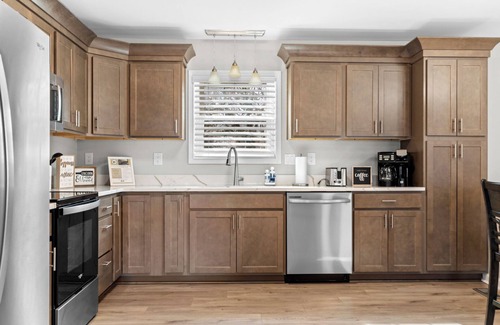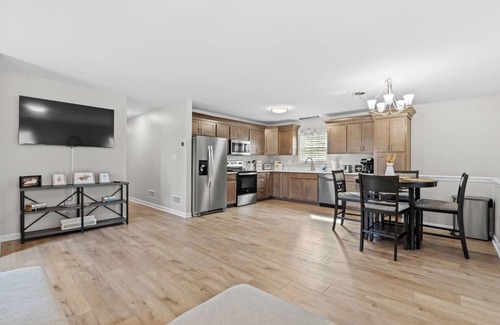 In November 2023, the entire home was remodeled including all new laminate flooring, paint, and furniture along with all new bathrooms and kitchen including all new cabinets and appliances, and so much more. With two king bedrooms and one full bedroom on the main level and a queen sofa sleeper in the walkout basement, this home sleeps up to 8 people. (Fireplace is not available for use, so please enjoy the propane firepit on the brick patio.)