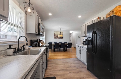 This newly renovated 5BR, 3BA home combines comfort, space, and convenience for groups of up to 10 guests. 4 Bedrooms with comfy queen mattresses, and 1 with two COMFY twin beds! All bedrooms have extra pillows and blankets for those chilly nights! With 3 Full bathsPerfect for families, couples, or Bourbon Trail/Derby travelers, the property offers two large living rooms, a dining room that seats 10 together, and a cozy sitting room that opens to a covered porch with seating for 4. The walk-out basement adds extra light and flexibility.
