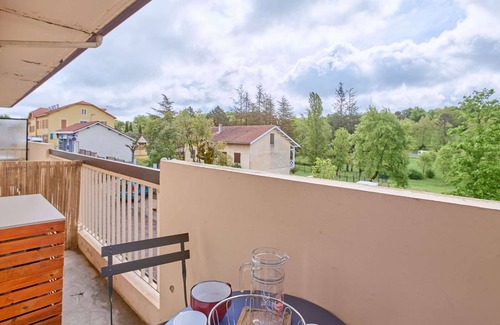 This bright and functional studio is ideal for a pleasant stay in the Gers region. This renovated, air-conditioned studio with a 22m² balcony is located on the 1st floor of the residence and faces south. It features two single beds, a television, a dining area, and a kitchen equipped with a mini-oven, microwave, electric stovetop, refrigerator, and a Senseo coffee maker. Its bathroom has a shower, vanity unit, and toilet.