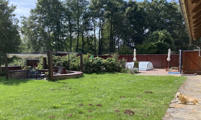 Relax walking down forest paths near a river in the Czech countryside. Stay in our renovated 200 year old stone cottage with 4 bedrooms, 3 baths, 2 spacious common areas, a built-in pool, hot tub, pool table, children’s play area, satellite television, Wi-Fi, grill and a large fenced in backyard. Powered by geothermal heat with solar panels and electricity, an electric stove, two refrigerators which can be stocked by many stores within 10 minutes. Only a 15 minutes drive from medieval Tábor, In the rolling hills only 1.5 Hours drive south of Prague. Come & chill!