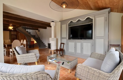 Upstairs, a majestic stone staircase with a wrought iron railing leads you to a splendid exposed roof structure and two spacious bedrooms, each with a double bed (180x200), ensuring absolute comfort. Combining authenticity, refinement, and high-end amenities, this house is the perfect setting for a timeless stay.