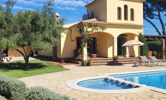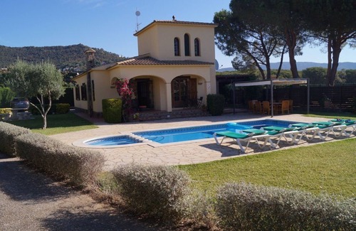 Our holiday home sits in a 1000m2 level plot at the foot of the Gavarres hills. Our prices are inclusive of cleaning every 7 days, bedding/linens/bath towels(for stays of 3 nights or more) Comfortably furnished throughout with air conditioning (free) in each bedroom pre-set to 24 degrees. The villa is well equipped for self-catering, both in the kitchen and garden, where there is a broad covered terrace alongside the large in-built barbecue. There are shady areas under the trees in which to eat, enjoy a drink or simply relax. Especially suited for families with younger children the garden is enclosed and the private pool, which is visible both from the terraces outside and the living room within, has a separate children's paddling pool end. The pool is in the sun from early morning to late evening - meaning it is one of the warmest pools we have ever come across. With the added benefit of a paddling pool end and roman steps into the the main pool. The villa is equipped mosquito nets on bedroom windows for your added comfort. The perfect retreat if you have had enough of the beautiful beaches, countryside and medieval towns. . The village of Calonge close to the beautiful Les Gavarres nature reserve has several good restaurants, whilst within a 15 minute drive you will find the old town of Palafrugell and the pretty cove beaches of Llafranc and calella.