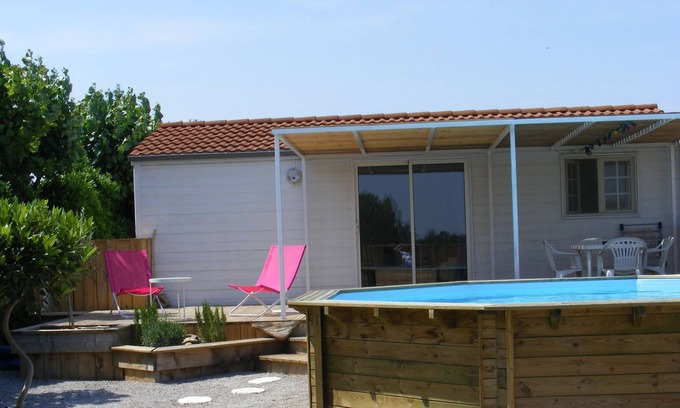 Modern air-conditioned comfortable chalet of 32m², for 2 people with private swimming pool, in a peaceful wine estate. Composed of a living / dining room with flat screen TV, an equipped kitchen with American fridge and dishwasher, a bathroom with shower cabin and a bedroom with double bed in 160 and dressing room. 30m² shaded wooden terrace with wooden swimming pool, garden furniture. Close to all shops, 4 km from the Canal du Midi, 35 km from the city of Carcassonne and close to the Cathar castles, 25 km from the sandy beaches, near the Fontfroide abbey. Between Narbonne and Lézignan Corbières.