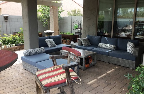 Perfect location, 1 mile walk to Clubhouse, Pro Shop, Restaurant and a North South lot. Which means “NO blaring sun in your face backyard”. If shopping for other rentals, ask which way the backyard faces. Enjoy 20 saguaros and native barrel cactus. Speaking of backyard, lot’s of fun, walled all sides, tree shower, two waterfalls, Kamado bbq, wood pit bbq, Teak root sink, 6 person, double half log glider, upholstery sofa console and hot tub.