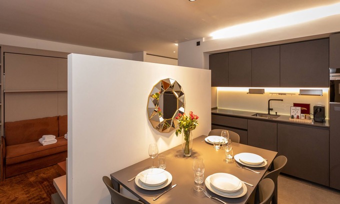 The studio sleeps up to 4 people. It has an elegant living area with a comfortable sofa, armchair, flatscreen tv and coffee table with a dining table for 4 people. The modern, open-plan kitchen has everything you might need for your stay: an induction hob, oven, fridge, freezer and a Nespresso machine.