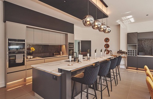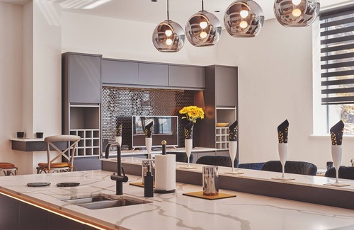 The kitchen area features an island/breakfast bar with stool seating where cocktails can be enjoyed as meals are prepared, before sitting down together for dinner. Top of the range Neff appliances include an American-style fridge/freezer with ice and water dispenser, plus an instant boiling water tap, while luxurious fixtures and fittings complete the look. For convenience the property has two fridge/freezers and two dishwashers.