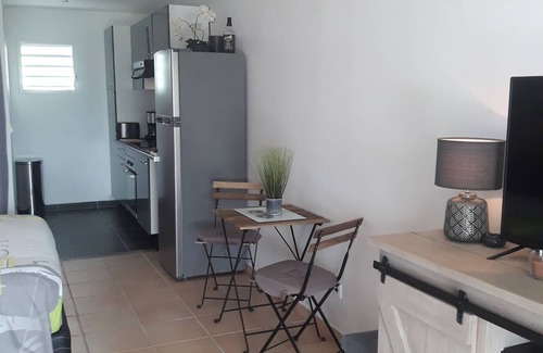 On the bay of marigot, for rent very nice studio tastefully decorated. Located in a secure residence with its swimming pool and its private beach which overlooks the Caribbean Sea and the island of Anguilla.