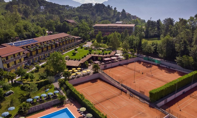 Large resort "Residence Campi", 3 storeys. 70 apartments in the residence. Above Limone sul Garda, outside the resort, 2 km from the centre of Voltino di Tremosine, in an elevated position, 7 km from the lake, in the countryside. For shared use: beautiful, well-kept garden (not fenced) with lawn and plants, natural garden, swimming pool, indoor pool (seasonal availability: 05.Apr. - 11.Oct. pool opening hours: 08:00-20:00). WC in the pool area, children's pool, tennis (8 x clay court), floodlit (extra), table tennis, beach volleyball. In the complex: reception, restaurant, bar, breakfast room, WiFi, sauna, fitness room, steam room, hot tub (all included), spa area for shared use, table football, lift, storage room for bicycles, washing machine (extra) (for shared use), bicycle rental. Linen change weekly (suppl. charge extra). Breakfast on request (extra). Parking on the premises. Shop 1 km, bus stop 600 m, pebble beach 7 km. Minigolf 50 m. Nearby attractions: Limone sul Garda 7 km, Salò 40 km. Please note: car recommended. Suitable for families, baby equipment on request (extra). The holiday properties may differ in situation, size and location. Wellness forbidden to children under the age of 18.