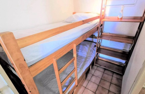 Accommodation: Maisonette studio cabin mezzanine Close to the beach - For 4 people - A cabin with bunk beds - A mezzanine with a double bed - Equipment: TV, ceramic hob, microwave, fridge-freezer, washing machine - Surface of 28 m² with a terrace of 10 m² - West exposure - Beach at 30 m and center at 1 km - Supermarket at 500 m - Closed collective car park with barrier, 2m high - Small pets accepted
