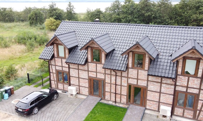 Brand new residence in Zastan. From the residence, all guests can use the private, wild path to the lake (approx. 100 m) or to the official public beach on the lake. From Zastan it is about 3 km to the famous seaside resorts of Miedzyzdroje or Miedzywodzie. The residence has 5 parking spaces for guests' cars, so it can be a nice place for family or business meetings. Some of the furniture in the house is made by famous Polish designers. The large number of bedrooms and bathrooms guarantee that up to 16 people can live comfortably at the same time. Guests can use two double kayaks and a 3-person rowing boat on site.