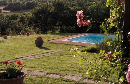 Apartment, part of a complex of 3 apartments, all separated. Nestled in the Tuscan countryside, equipped with all comforts, composed of a double bedroom, living room with double sofa bed, equipped kitchen, veranda, bathroom with shower. Outside, everything you need to fully enjoy the summer. In common with the other guests a swimming pool of 12x6 meters complete with all the equipment such as sunbeds, deckchairs, umbrellas. A large gazebo is available for a good rest.