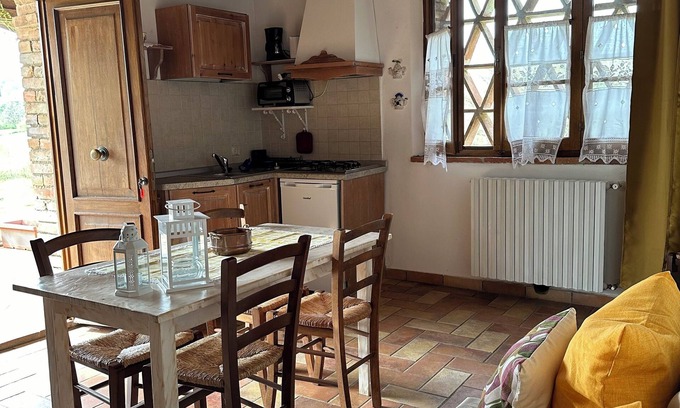 Apartment, part of a complex of 3 apartments, all separated. Immersed in the Tuscan countryside, equipped with all comforts, consisting of a double bedroom, living room with double sofa bed, equipped kitchen, veranda, bathroom with shower. Outside everything you need to fully experience the summer. In common with the other guests a swimming pool of 12x6 meters complete with all equipment such as sunbeds, deckchairs, umbrellas. There is a large gazebo for an excellent rest.