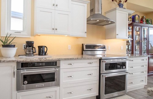 Kitchen and Dining - The large island seats up to four comfortably and the dining table seats up to six. Cooks...we have a double oven with an induction cook top. The kitchen, butler's pantry and walk in pantry are well stocked with plenty of cookware, serve-ware, counter top appliances, and basic cooking and baking ingredients for guest use. Two refrigerators upstairs and one frig downstairs.