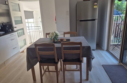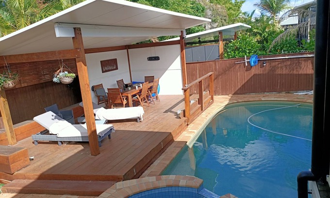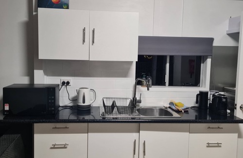 The sleepout is a detached building that is separated from the house by a breezeway. This truly is a place that you can unwind. sitting pool side has something very special about that aspect. I have one cat that roams around the property. He's in his advanced years and keeps to himself mostly. He doesn't come into the unit. The sleepout is nicely done and has all the mod cons and appliances you'll need. Which include the likes of a large TV, toaster, microwave, fridge/freezer, AC, Wi-Fi, hair dryer, portable speaker, alarm clock, small oven, coffee pod machine, activity books, and a kettle. Can sleep up to two people. There is no free standing oven. It does have an electric fry pan, small bench top oven and you are also welcome to use the BBQ outside.