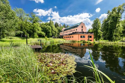 The Svatá Kateřina Resort is located in the middle of the woods in the Highlands. Motor vehicles are not allowed within the Resort, free parking is available at the guarded car park in Počátky (2.8 mi). Transport to the Resort is provided free of charge by the hotel shuttle bus. Accommodations is available at the Hotel Svatá Kateřina, Hotel Garnison and Hotel Gymnasion. Wi-Fi is free throughout the Resort. There are no TVs. The Svatá Kateřina Resort is a unique place in the middle of nature with the healing waters of the Svatá Kateřina Spring and fresh mountain air. All rooms have a bathroom with a shower, some also with a bathtub. Wellness at the Svatá Kateřina Hotel is free of charge. Wellness & Spa in the Ayurvedic Pavilion is for a fee. Children under 6 years are welcome only on selected dates. The hotel's restaurant serves a rich breakfast buffet. Mediterranean, Czech and Indian cuisine can also be ordered from the menu. An outdoor terrace by the pond is open in the season. The unique Ayurvedic Pavilion, the Building of the Year 2019 is the gem of the Svatá Kateřina Resort. This pavilion features a swimming pool, jacuzzi, sauna, steam room, and relaxation areas. There are also six Ayurvedic massage cabins and an Ayurvedic doctor's office. The Resort also offers massages, cosmetics, manicures, pedicures, open-air whirlpools and other services - yoga lessons, sports lessons, horse riding, mountain bikes, golf driving range, rental of sports equipment (winter and summer sports). Outdoor swimming is possible in the natural lake in the area. Public transport: In case you would like to use the public transport, we will pick you up at the bus station in Počátky (close to Pelhřimov) or train station Počátky-Žirovnice. The Resort is located 81 miles from Prague and 75 miles from Brno, near the UNESCO heritage town of Telč.