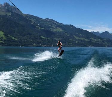 28 miles from Salginatobel Bridge in Unterterzen, Resort Walensee 45 offers accommodations with access to a sauna and hot tub. This beachfront property offers access to a patio, table tennis, free private parking, and free Wifi. The property provides a children's playground and outdoor furniture. Offering a terrace and mountain views, the spacious apartment includes 2 bedrooms, a living room, cable flat-screen TV, an equipped kitchen, and 1 bathroom with a bath and a shower. Towels and bed linen are featured in the apartment. There's also a seating area and a fireplace. Buffet and continental breakfast options with fresh pastries, pancakes, and fruit are available. Guests may eat at the on-site family-friendly restaurant, which is open for dinner, lunch, and cocktails. The area is popular for fishing and walking tours, and free use of bicycles is available at the apartment. Skiing and cycling can be enjoyed nearby, while a ski equipment rental service, a private beach area and a ski pass sales point, are also available on-site. Liechtenstein Museum of Fine Arts is 22 miles from Resort Walensee 45, while UNESCO World Heritage Tectonic Arena Sardona is 25 miles away. St. Gallen-Altenrhein Airport is 52 miles from the property.