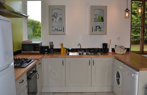 Your kitchen area is modern and very well equipped and you will find a large fridge freezer, electric fan oven, gas hob, extractor fan, microwave, washing machine, Dolce Gusto coffee machine, kettle, toaster and dishwasher here. The cupboards, as well as the large, French art nouveau dresser in the living area, contain all the glasses, plates, pots and pans you could wish for, not forgetting the all important corkscrew and fixed bottle opener. We provide condiments, olive oil, tea, coffee and your welcome pack will include wine, pastries, bread, jam, fruit, yoghurt and other goodies to see you through your first evening and/or morning.