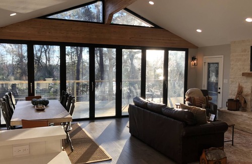 Gorgeous forest and partial lake view through a wall of windows, that lead to a double-tiered deck among the trees. A restful get-away from city stress. At our hillside retreat you can experience the solitude and quiet by the lake. Catch up on that book you've been wanting to read out on a lounge chair on the elevated deck. If you work remotely, connect to the WiFi and spend your day sipping coffee and taking meetings with a view, and unwind in the evenings binging your favorite show on one of our three smart TVs.