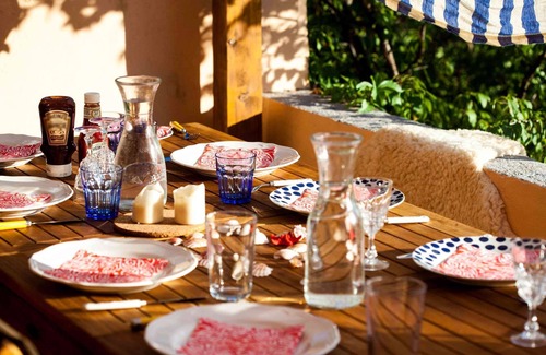 The middle floor is accessible via an outside staircase. The highlight is the large terrace with shade awning and a view of the garden. The large extendable teak table can seat up to ten people. On the large electric grill station you can safely prepare fish, meat and chicken for larger groups outdoors.