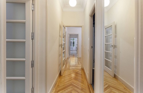 The classic French style of the dwelling, with beautiful wooden floors, large street-facing balconies, or high coffered ceilings, has been combined with a warm decoration seeking natural materials and soft colours to provide warmth to the environment. The apartment has capacity for 8 people distributed in 3 double bedrooms, two with a double bed and one with two single beds, in addition to a comfortable double sofa bed in the living room. The rooms are oriented towards interior courtyards and all have a wardrobe, one of them with direct access to the hall through a glass door and privacy that has an en-suite bathroom with a shower. Additionally, the apartment has another bathroom that leads to the corridor. The kitchen, at the end of the corridor, facing an interior courtyard, is fully equipped and has a round table for breakfast, it has a dishwasher, washing machine, oven - microwave and other small appliances.