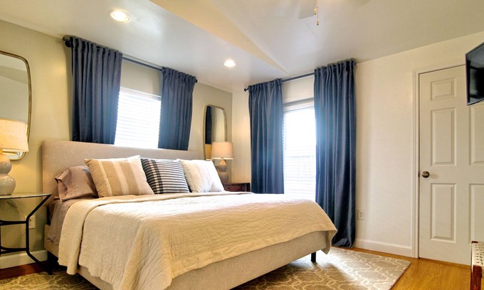 Completely renovated 1930 Bungalow inside the loop in the Heights. Quiet residential street yet across the street from a quintessential neighborhood bar in Cottage Grove. Small enclosed side yard. Plenty of parking. All brand new appliances and furniture. King bedroom has it's own TV and a private bathroom with walk in shower and back door to fenced in courtyard. Smaller bedroom has a double bed. Just 2 blocks from 1-10 access. Five miles to downtown and six miles to Galleria area.