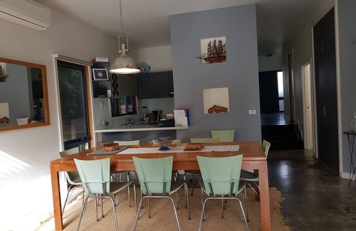 Luxury beach house with an amazing coastal retreat garden, outdoor hot/cold shower, hammocks, fenced back yard, out door room, 2 outdoor day beds, a fire pit area. large paved BBQ entertaining area. A large carport has two enclosed sides, for two cars, or boat. The house is located within walking distance to the beach and wetlands located behind the beach via a walking track all the way to Corinella.