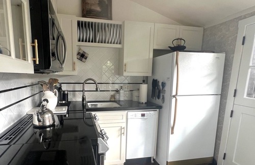 The downstairs bedroom has a beautiful queen size bed also clothed in crisp, clean linens. Just down the hall is the 2nd bath. Luxurious with its inviting, deep soaking bathtub with spray attachment. Both baths have been redone with vintage style tile floors giving them a bright, clean feel upon entering.