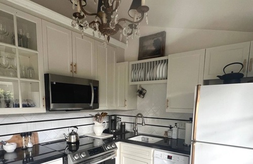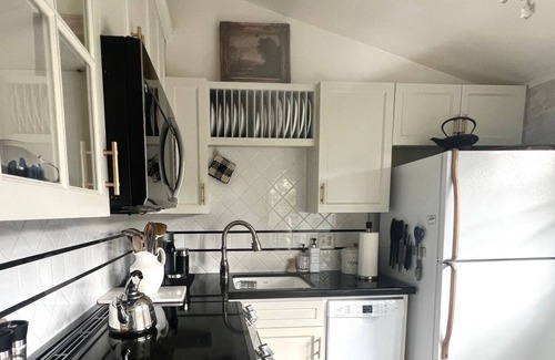 The cottage has two bedrooms. The upstairs bedroom and bath are en-suite with a plush king size bed clothed with clean, crisp linens. The bathroom has a spa like feel with a soaking bathtub and shower for ultimate relaxation. Natural light from the skylight above adds to the soothing atmosphere.
