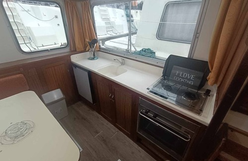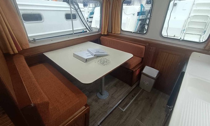 Come aboard the Pénichette 935W. You'll be peacefully moored at the quayside and enjoy a tranquil stay aboard this retro-style boat. This private space has 5 berths, including 1 cabin with double bed and single bed, plus a bench seat in the living room that converts to a double berth. At the bow of the boat, on the outside deck, you can soak up the sun, enjoy a drink or read a book.