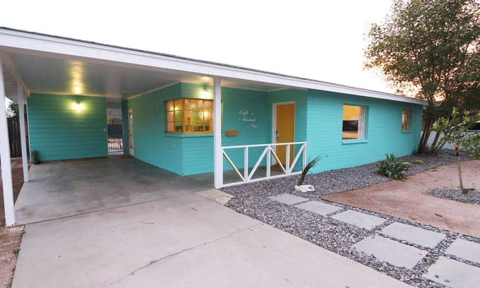 Each room of this 50's ranch has been themed to create an authentic atomic era vibe. Bold colors, mid-century furnishings and original artifacts are used throughout to help make your stay a time traveling experience. The single level home also boasts a private, fenced 1/4 acre lot where two and four legged guests can enjoy Arizona's amazing sunshine. A private office space is located in a room separate from the main house to provide a quiet place for Zoom meetings, writing or Vlogging.
