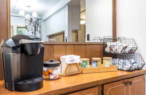 The kitchen has a refrigerator/freezer, oven, stove, and microwave. Please note there is no dishwasher. We have pots, pans and utensils, a fully stocked kitchen. We offer a Keurig coffee maker with coffee, decaf and tea pods provided. French press coffee maker available for use.